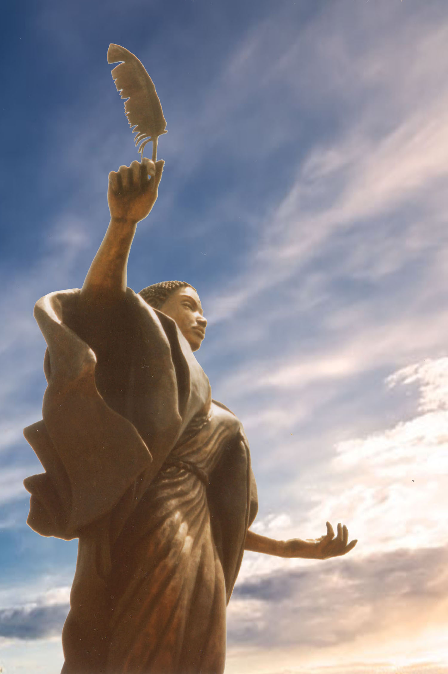 On May 11, 1996 I unveiled my 16 foot tall bronze statue, the Mother of Humanity®. It was my statement of peace within the human family as well as a symbol of empowerment for mothers around the world. The face of the Mother of Humanity® has African, Asian, and European features. She is holding a feather of peace, truth and righteousness in her right hand. Her left hand is extended in a gesture of welcome, calling all peoples of the world together as one human family. Her right breast is bare to remind us that we have all nursed at the breast of the African woman. It also calls us to explore that as the cradle of civilization, nations around the world still continue to nurse on the raw and strategic minerals from the African continent. The left foot on the Mother of Humanity® monument steps forward on the globe of the world and indicates that with our heart being on the left side of the body, we should always step forward with “heart” and “righteous intent”. The dot on the forehead of the Mother of Humanity® reminds us of our “third eye” of inner vision and spiritual wisdom. The outline of the shape of the Mother of Humanity® is in the shape of the continent of Africa, birthplace of humanity.